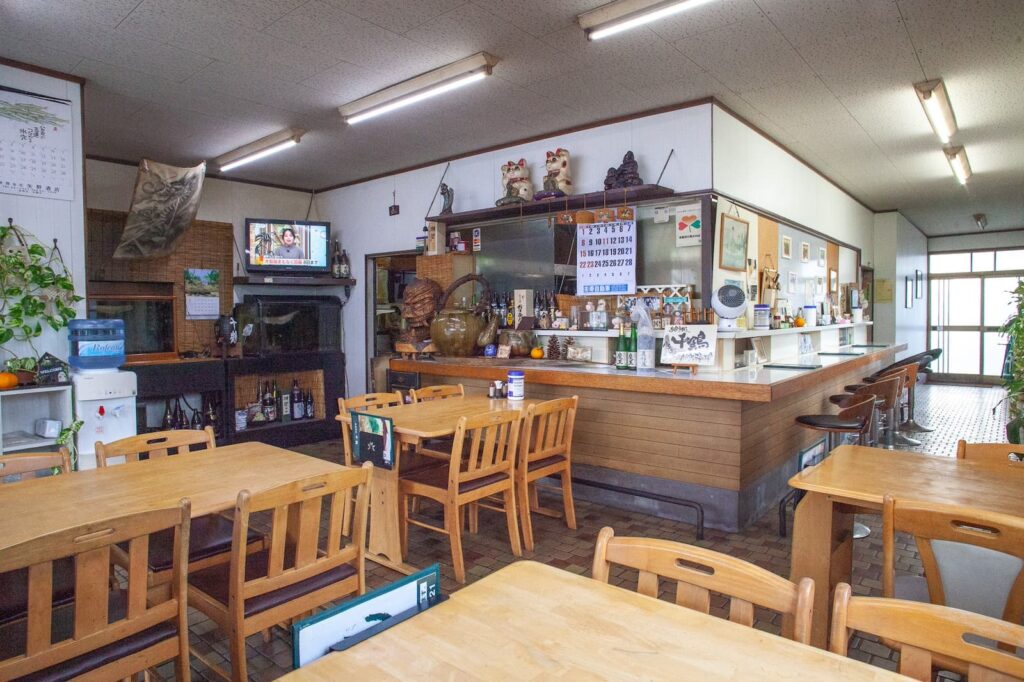 鹿島駅から歩くこと5、6分。国道444号線を渡ると、暖簾の向こうからだしの香りが流れてきます。出迎えてくれるのがお食事処千鶴。看板には、折り鶴があしらわれ、どこか懐かしさを感じます。暖簾をくぐると、昔ながらの大衆食堂を思い出させるテーブルとカウンターが広がります。